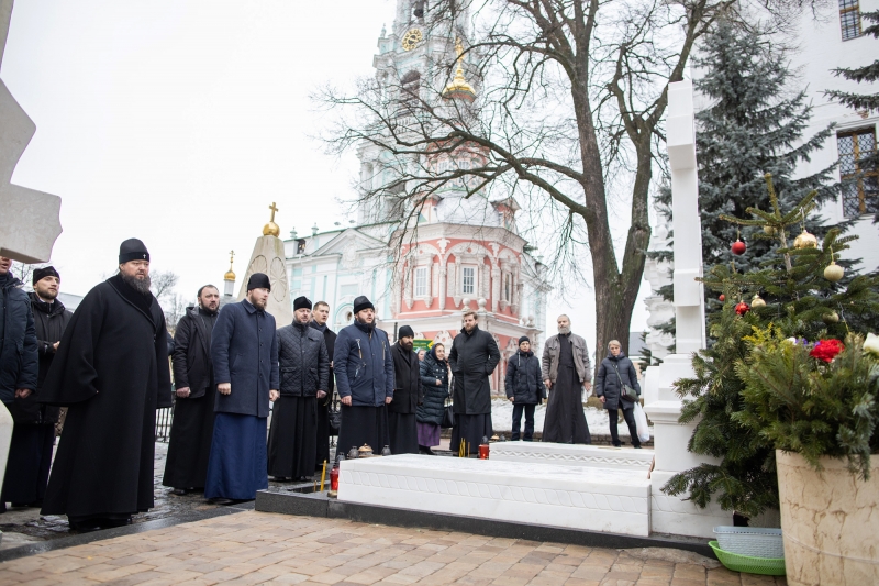 По пути в Троицкий собор иеродиакон Георгий рассказал об истории Предтеченского и Духовского храмов. На некрополе Духовского храма митрополит с клириками приложились к надгробным крестам на могилах лаврских архимандритов Кирилла (Павлова) и Наума (Байбородина) и пропели «Вечную память».