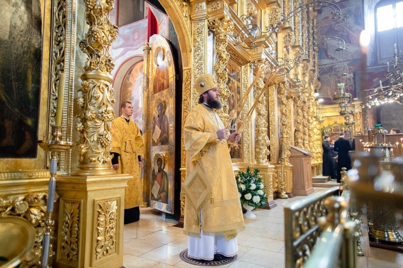 Божественную литургию в Успенском соборе Лавры совершил наместник епископ Фома в сослужении насельников монастыря в священном сане.