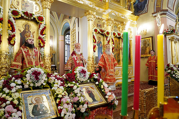 По окончании Литургии игумения Феофания (Мискина) от лица сестер Покровского монастыря и паломников приветствовала Святейшего Владыку и преподнесла Его Святейшеству икону святой Матроны Московской и букет цветов.