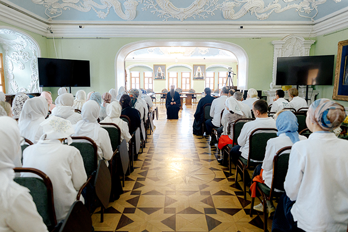В начале беседы владыка отметил высоту и важность исполняемого добровольцами при взаимодействии с паломниками в Троицком соборе Лавры послушания и поблагодарил за труды.