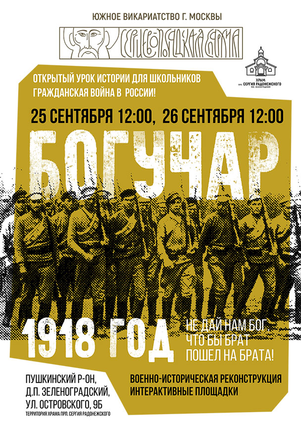 25–26 сентября 2021 года Сергиево-Посадская и Дмитровская епархия Русской Православной Церкви совместно с Южным викариатством г. Москвы, подворьем мужского ставропигиального Донского монастыря в д.п. Зеленоградский проводит открытый урок истории для школьников «Богучар 1918 год. Не дай нам Бог, чтобы брат пошел на брата!», посвященный событиям гражданской войны в России. Урок проводится на открытом воздухе, на территории храма преподобного Сергия в д.п. Зеленоградский, организационно состоит из двух частей и ориентирован на учеников 6–11 классов (12–17 лет), общим количеством до 500 школьников единовременно. Приглашаются к участию классные руководители, педагоги и все желающие.
