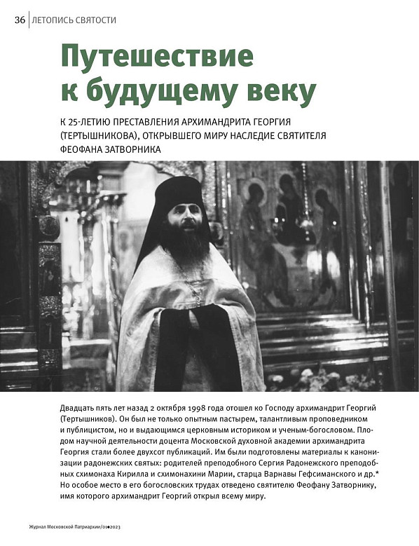В официальном календаре Московской Патриархии в качестве одной из значимых юбилейных дат 2023 года отмечено 25-летие со дня преставления лаврского насельника архимандрита Георгия (Тертышникова) — богослова, открывшего миру наследие святителя Феофана Затворника. К этой знаменательной дате приурочена статья иеромонаха Пафнутия (Фокина), опубликованная в первом номере «Журнала Московской Патриархии» за 2023 год. В обращении редакции журнала к читателям говорится: «Почувствовать, к чему призывает Господь, — важнейшая задача каждого священника. Святитель Феофан Затворник, рассуждая о призвании христианина, отмечал, что “ни один член тела Церкви не может за собою одним удерживать дар (и свои труды), но действенность его предает всем братьям о Христе — всей Церкви”. О выдающемся исследователе трудов епископа Феофана архимандрите Георгии (Тертышникове) в связи с 25-летием его кончины читайте в статье “Путешествие к будущему веку”».