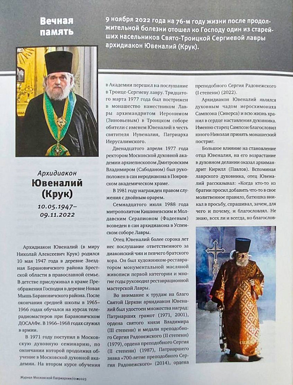 Также в номере опубликован некролог, посвященный отошедшему ко Господу 9 ноября 2022 года архидиакону Ювеналию (Круку) — одному из старейших лаврских насельников, который более 40 лет нес послушание ответственного за диаконский чин и певчего братского хора.