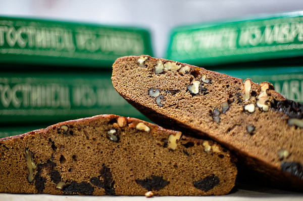 Коврижка темно-коричневого цвета, поскольку при изготовлении используют солод, как это делали в XIX веке. Кроме того, в состав выпечки входят только натуральные компоненты: мед, корица, чернослив, орехи и т.д. Здесь нет никаких красителей, заменителей и ароматизаторов. Поэтому лакомство получается не только сладким, но и полезным.