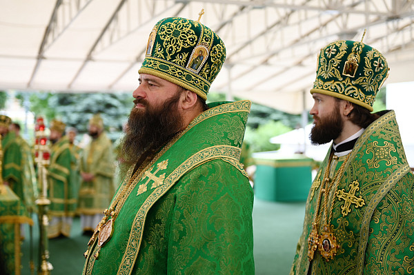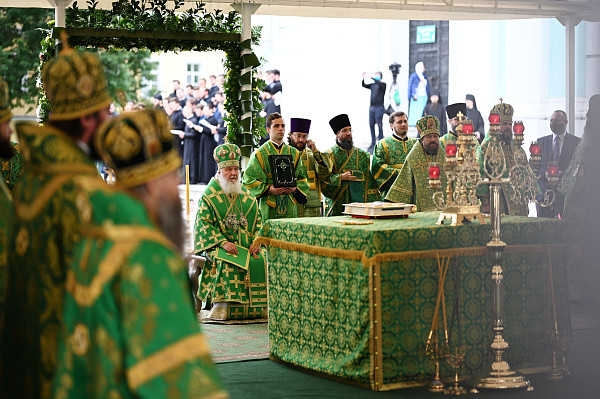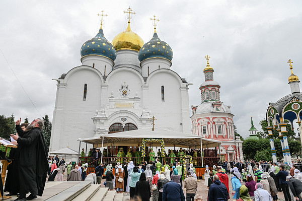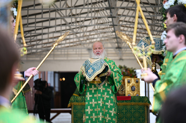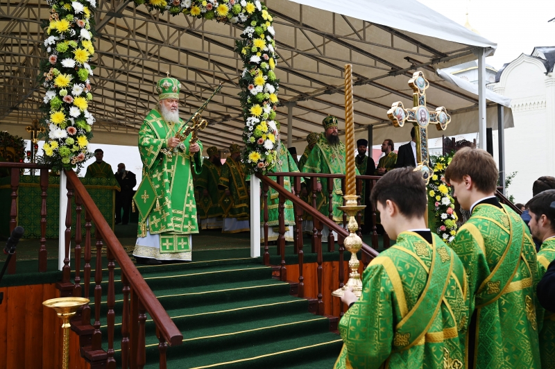 Затем на Соборной площади Троице-Сергиевой Лавры Святейший Патриарх Кирилл возглавил служение Божественной литургии.