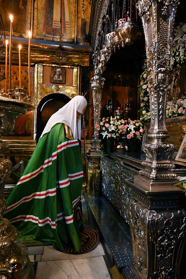 Святейший Владыка проследовал в Троицкий собор, где поклонился честным мощам преподобного Сергия Радонежского, святыням Никоновского придела и Серапионовой палаты.