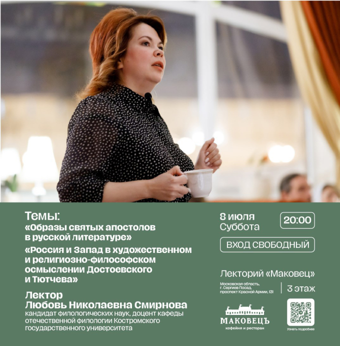 8 июля в 20:00 в ресторанном комплексе «Маковец» пройдет просветительская лекция на темы «Образы святых апостолов в русской литературе» и «Россия и Запад в художественном и религиозно-философском осмыслении Достоевского и Тютчева».