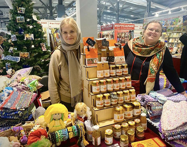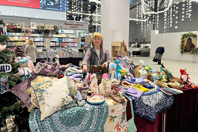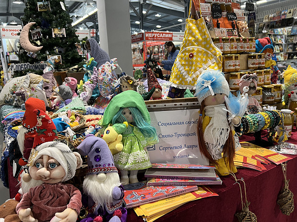 В рамках рождественского фестиваля Социальная служба Свято-Троицкой Сергиевой Лавры представила на благотворительной ярмарке различные поделки: домотканые коврики, вязаные игрушки, текстиль для дома и украшения.