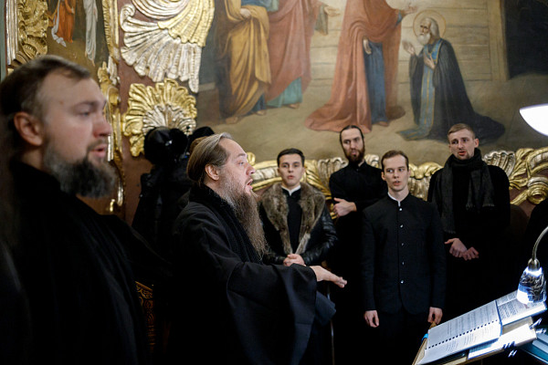 Вечером пели: слева — хор под управлением игумена Силуана (Баранова), справа — хор под управлением иеромонаха Нестора (Волкова).
