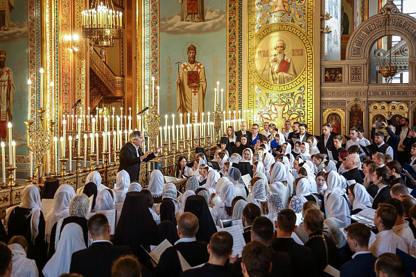 Богослужебные песнопения исполнили Патриарший хор Храма Христа Спасителя (регент — И.Б. Толкачев) и сводный хор победителей II Патриаршего фестиваля духовной музыки «Свет Христов» (регент — заслуженный артист России А.А. Пузаков).