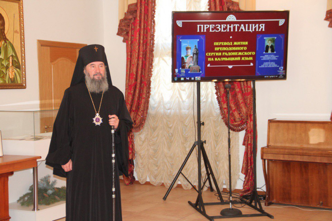 Архиепископ Юстиниан поздравил всех с выходом перевода на калмыцкий язык Жития преподобного Сергия, подчеркнув значение этого события в культурной и духовной жизни Калмыкии. Владыка напомнил о почитании Игумена Радонежского в регионе: в Элисте построен храм-часовня в честь Преподобного, его имя носит городские сквер и улица, а также Русская национальная гимназия. В 2007 году рядом с Казанским кафедральным собором был установлен памятник преподобному Сергию, который освятил Святейший Патриарх Кирилл, тогда митрополит Смоленский и Калининградский.