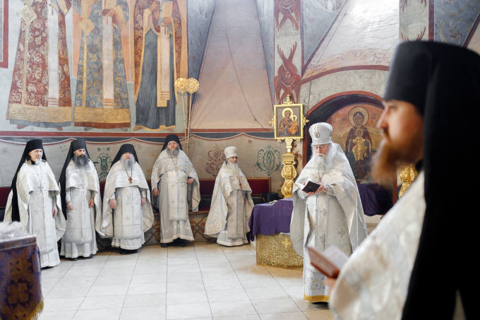 Богослужение накануне вечером и позднюю субботнюю Литургию в Успенском соборе возглавил архимандрит Макарий (Веретенников).