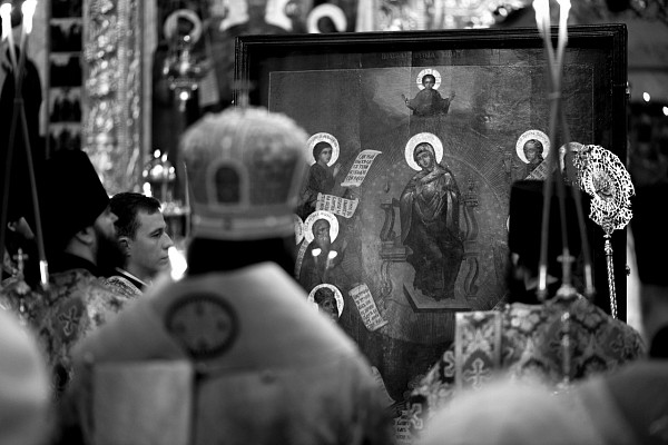 Вечернее богослужение в Успенском соборе Лавры совершил наместник епископ Сергиево-Посадский и Дмитровский Фома. Владыка вместе с насельниками обители в священном сане прочитал акафист Пресвятой Богородице.