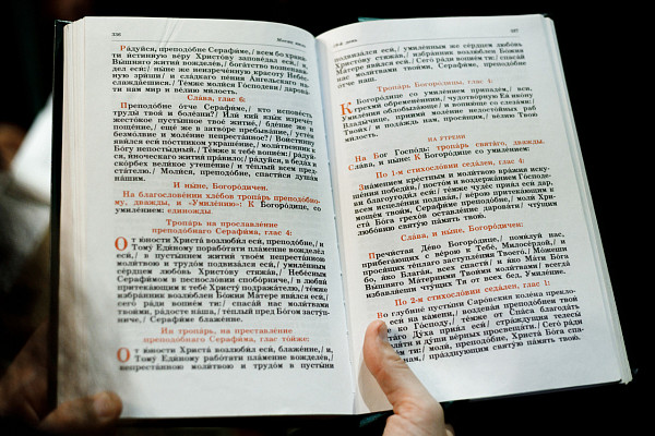 «От юности Христа возлюбил еси, блаженне, и Тому Единому работати пламенне вожделев, непрестанною молитвою и трудом в пустыни подвизался еси, умиленным же сердцем любовь Христову стяжав, избранник возлюблен Божия Матери явился еси. Сего ради вопием ти: спасай нас молитвами твоими, Серафиме, преподобне отче наш».