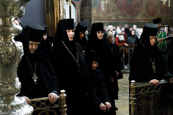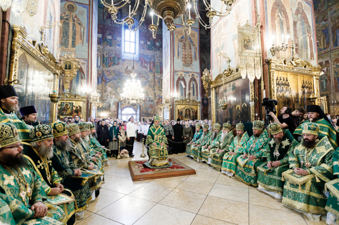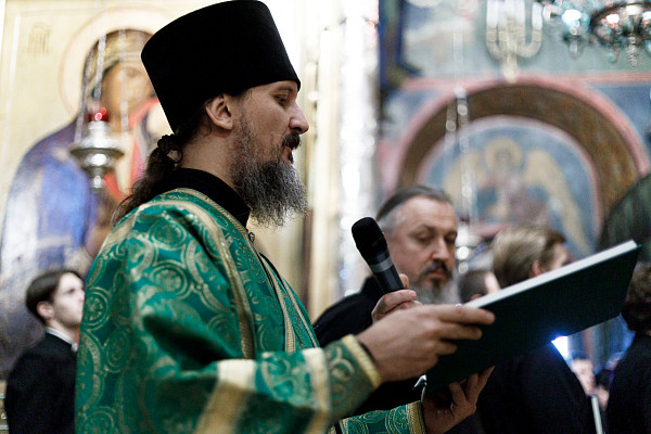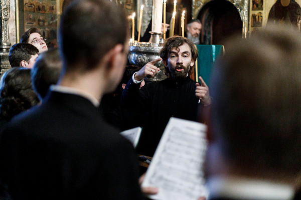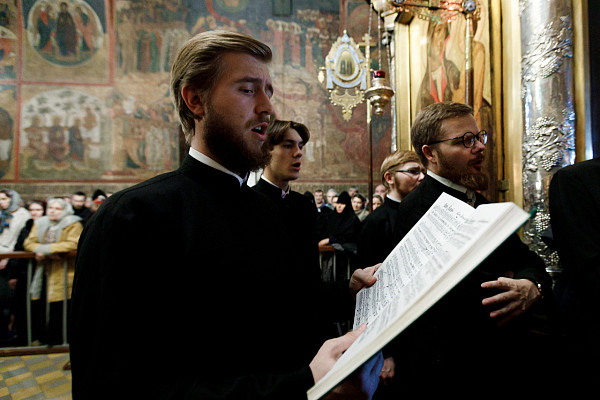 За Божественной литургией в Успенском соборе песнопения исполнили: справа — мужской хор под управлением иеромонаха Нестора (Волкова), слева — мужской хор под управлением чтеца Владислава Пилюгина. За молебном пел хор под управлением иеромонаха Нестора (Волкова).