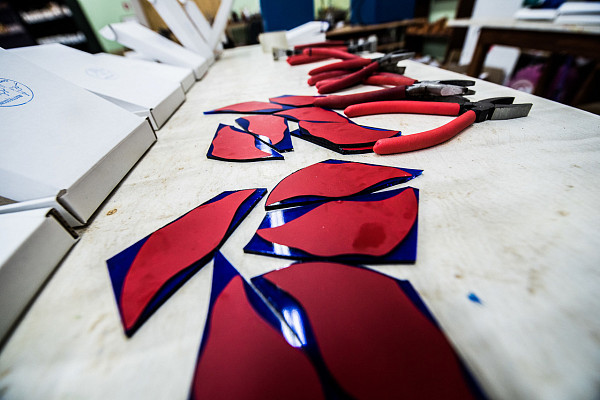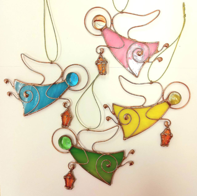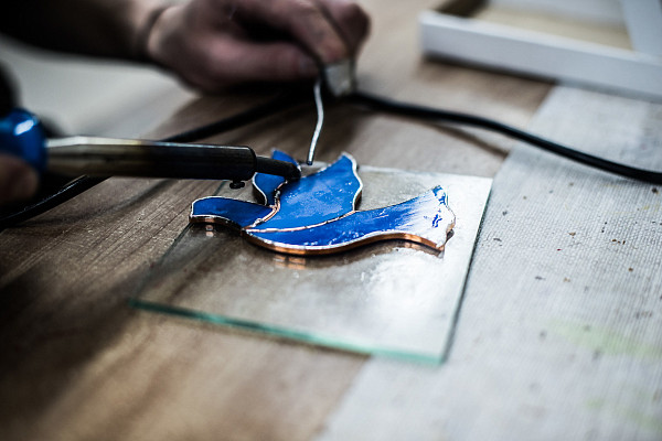 Мастера создают сувенирную продукцию в витражной технике «Тиффани». Фигурки вырезают из цветного стекла по трафарету, затем обматывают медной фольгой и спаивают. Для изготовления используют профессиональные шлифовальные машинки и стеклорез.