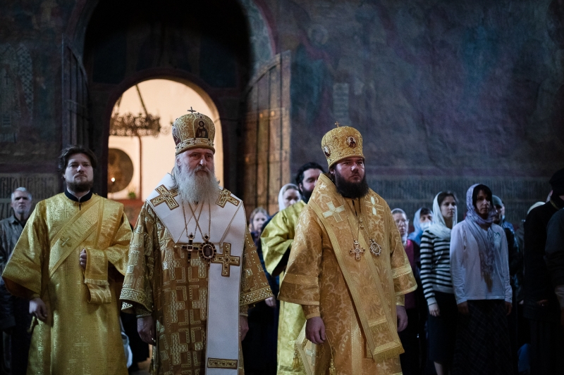 Божественную литургию в Троицком соборе Лавры возглавил председатель Синодального отдела по монастырям и монашеству архиепископ Каширский Феогност. Ему сослужил наместник обители епископ Сергиево-Посадский Фома. В алтаре молится епископ Дмитровский Феофилакт.