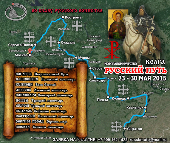 "С 23 по 30 мая 2015 года Федерация Мототуризма России проводит мотопаломничество "Волга – Русский Путь" по маршруту: Саратов – Алексеевка – Кузнецк – Пенза –Санаксара - Дивеево – Муром – Суздаль – Кострома – Сергиев Посад - Москва.