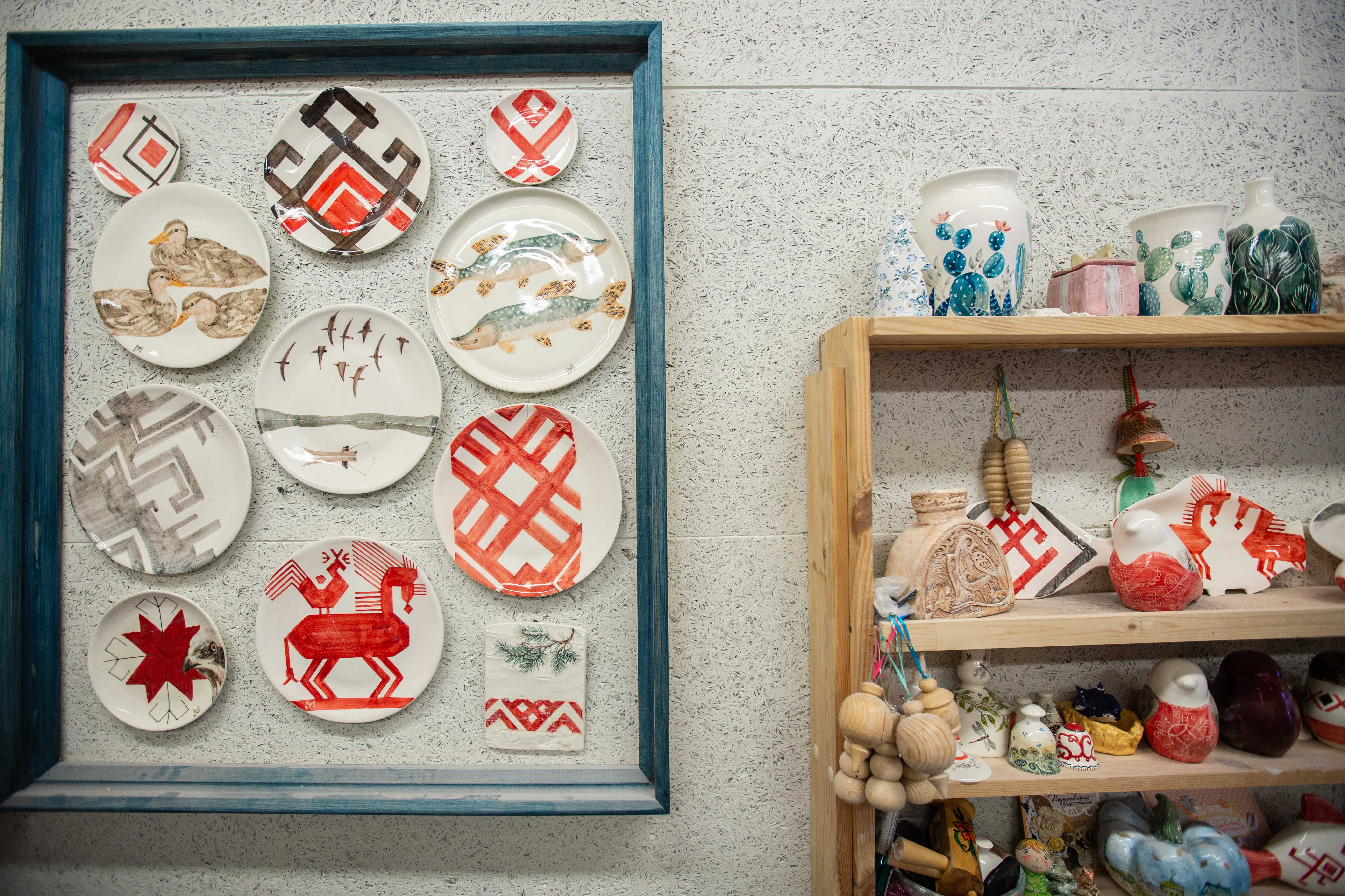 Ольга провела для первоклассников экскурсию по столярной и гончарной мастерским и показала деревянные игрушки и изделия из фарфора, сделанные умельцами Дворца интересов.