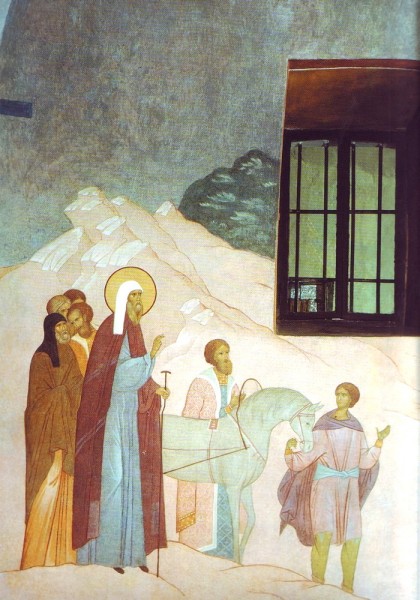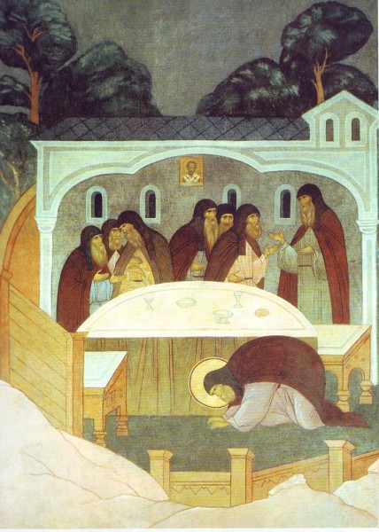 Прп. Сергий, трапезуя с братией, безмолвно поклонился благословению свт. Пермского Стефана, проезжавшего в Москву далеко от обители