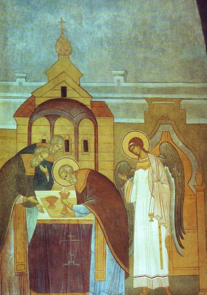 Прп. Сергий во время Божественной Литургии сподобился видимого сошествия Святого Духа в образе огня на Святые Дары и сослужения Ангела