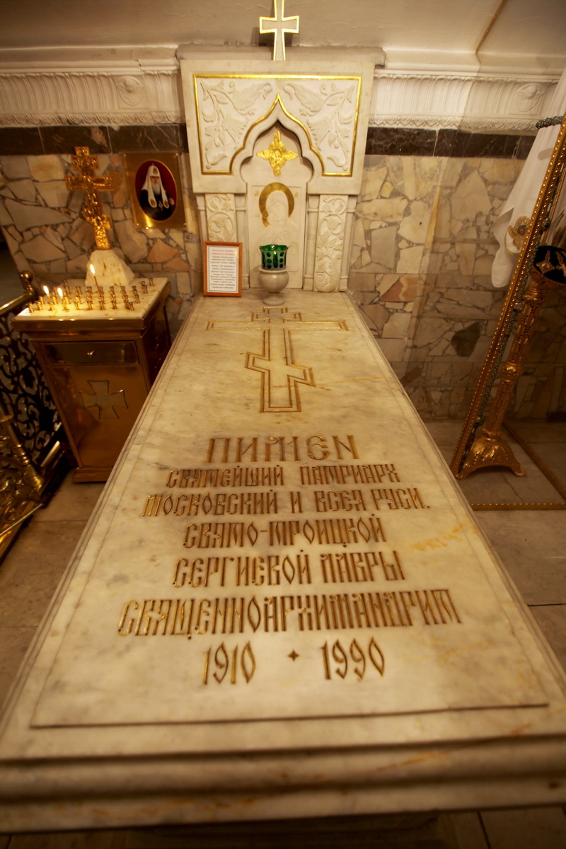 Святейший Патриарх Пимен был погребен в крипте Успенского собора Свято-Троицкой Сергиевой Лавры возле могилы его предшественника Патриарха Алексия I.
