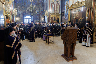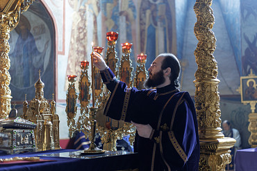 7 марта в Лавре прошли богослужения утрени, часов, изобразительных, вечерни с Литургией Преждеосвященных Даров и чтением канона вмч. Феодору Тирону. Службу возглавил архим. Макарий (Веретенников).