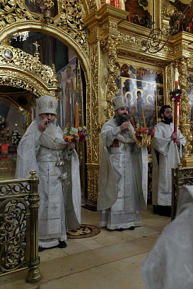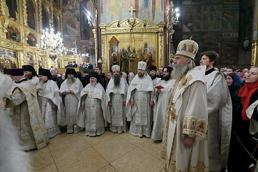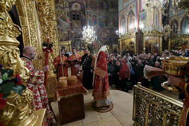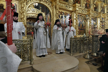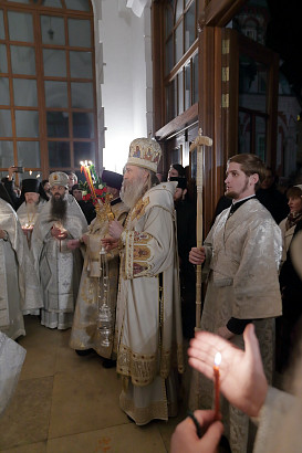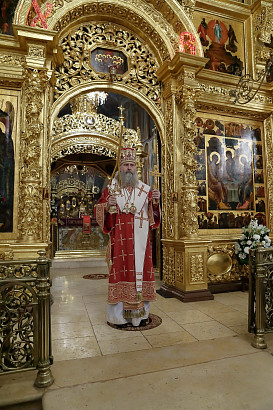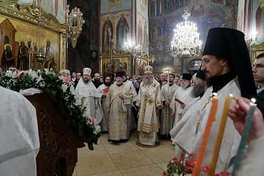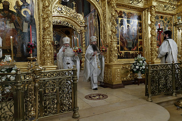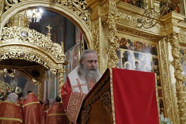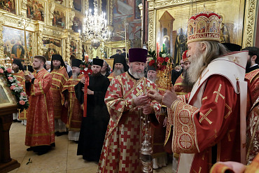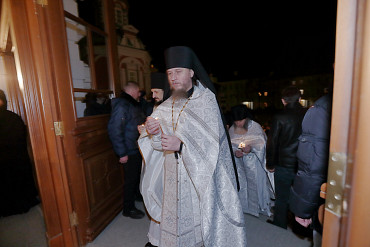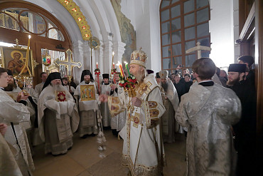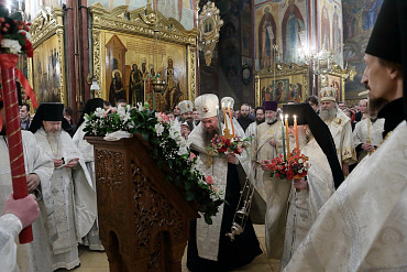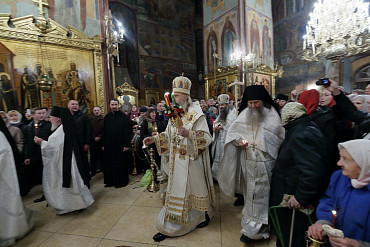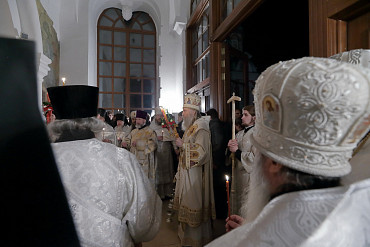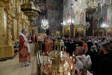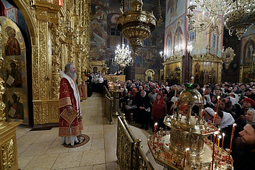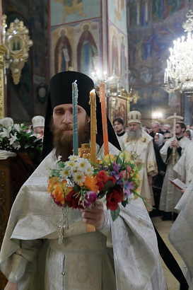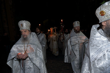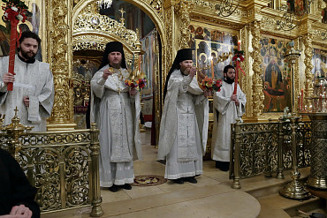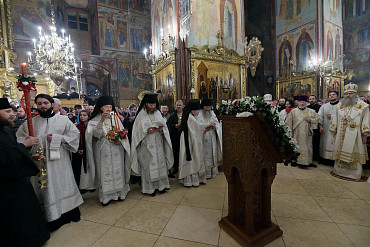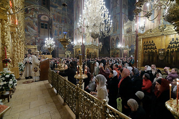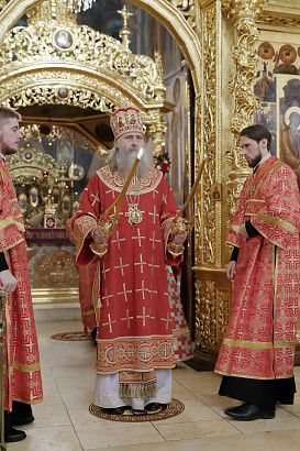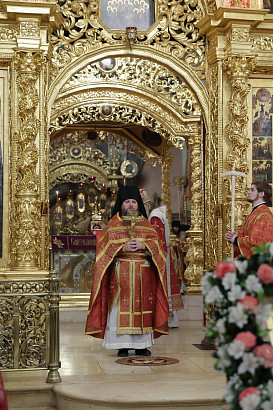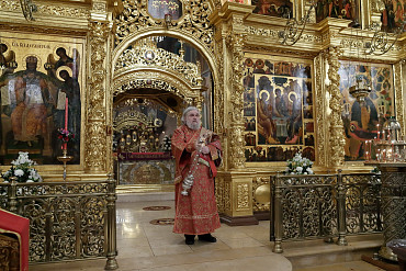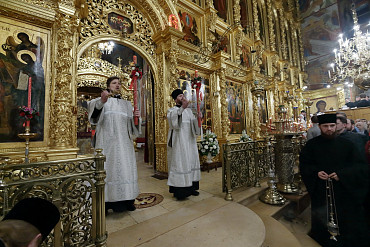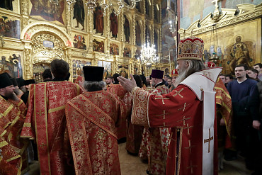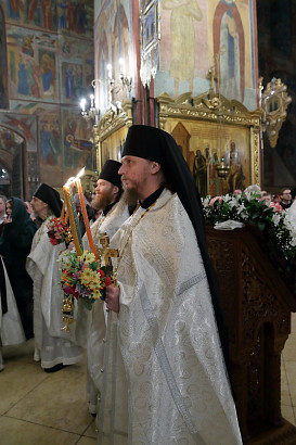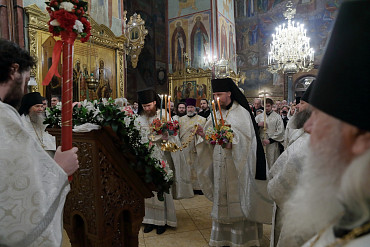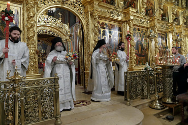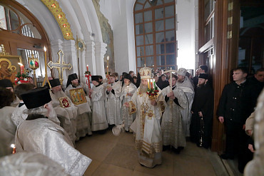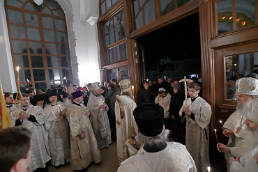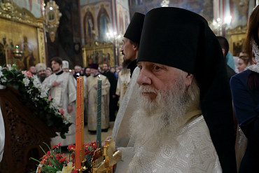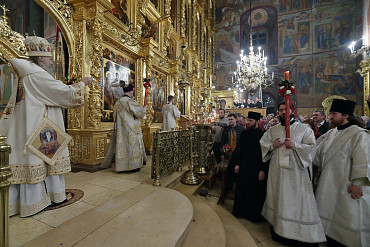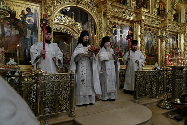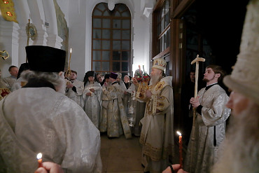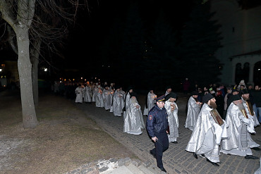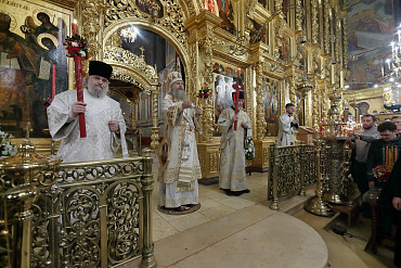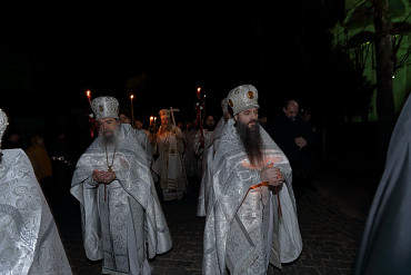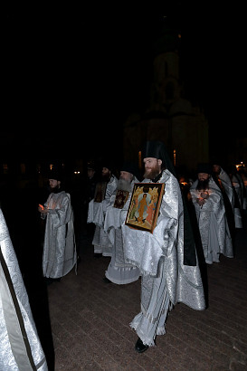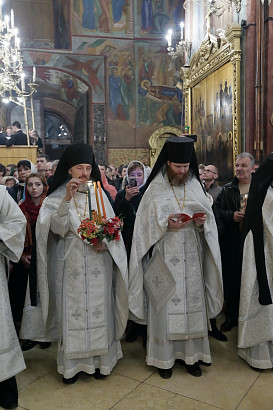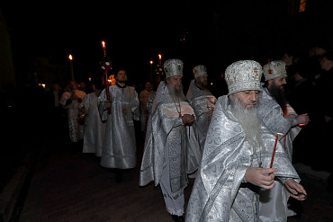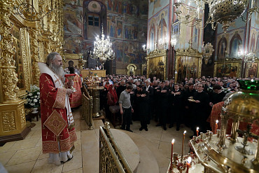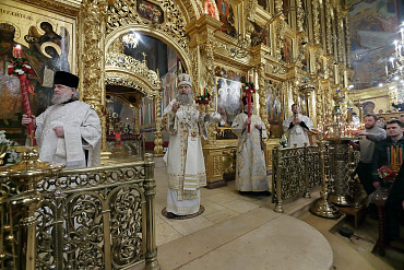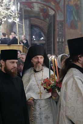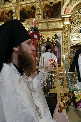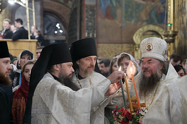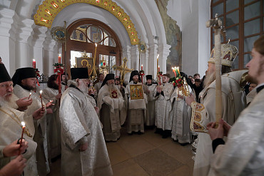 Ночное Пасхальное богослужение в Успенском соборе обители возглавил наместник Свято-Троицкой Сергиевой Лавры архиепископ Сергиево-Посадский Феогност.