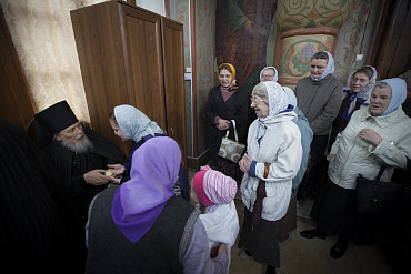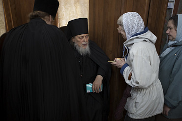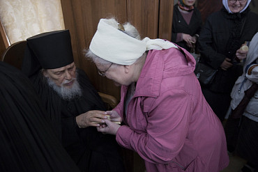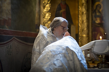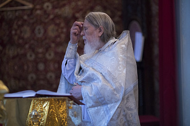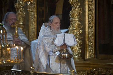 Ранняя Литургия в Успенском соборе Лавры в день памяти прпп. отец наших Кассиана и Лаврентия Комельских, день тезоименитства старейшего насельника Свято-Троицкой Сергиевой Лавры архимандрита Лаврентия (Постникова). 29 мая 2017 год. Фото: пресс-служба Лавры.