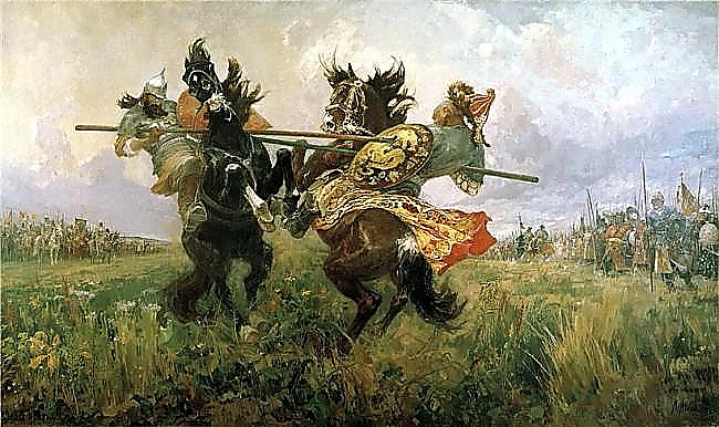 В день решающей битвы из монгольского войска против русских выехал огромный и страшный воин Челубей. Он потрясал огромным копьем и хохотал, уверенный в своей быстрой победе. Многих и многих он победил и лишил жизни. Челубей был настолько лютым, что его боялись даже свои. На бой с ним вышел монах Пересвет. Он помолился, и перекрестившись, храбро бросился навстречу врагу.