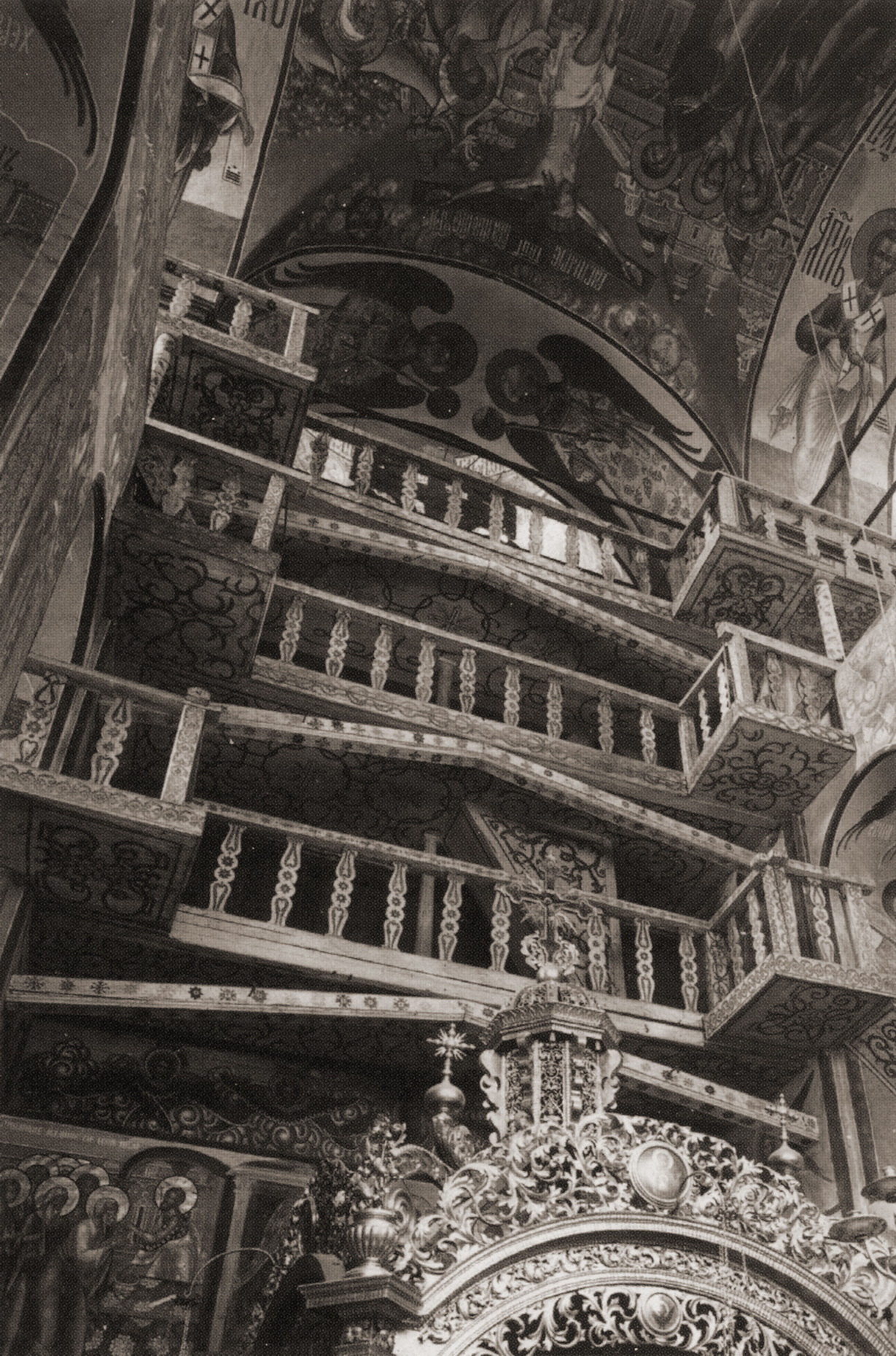 На уникальной исторической фотографии конца XIX в. запечатлены расположенные в алтарной части Успенского собора Троице-Сергиевой Лавры за иконостасом деревянные расписные хоры (балкон) в виде 3-хярусной галереи, аналогичные хорам Успенского собора Московского Кремля.