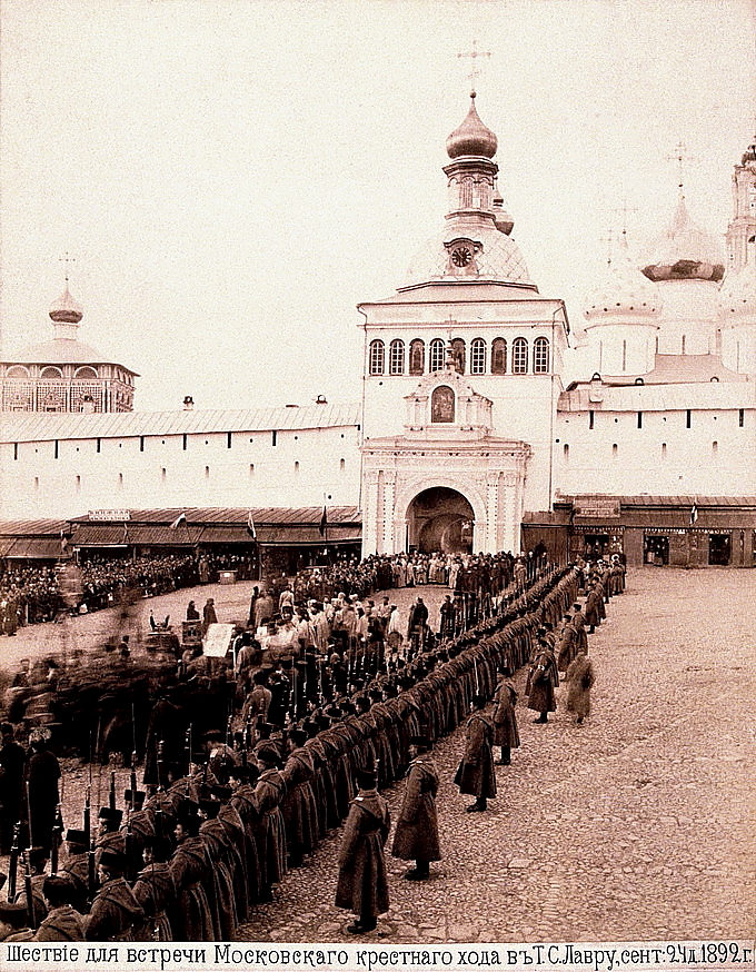 На фотографии изображен выход из Святых врат крестного хода братии монастыря во главе со Священноархимандритом Лавры митрополитом Московским Леонтием (Лебединским) для встречи московского крестного хода, приближающегося по Московской улице к Пятницкой и Введенской церквам у подножия Маковецкого холма. В оцеплении у Святых врат стоит сводная рота прибывшего из Москвы Троице-Сергиевского резервного батальона.
