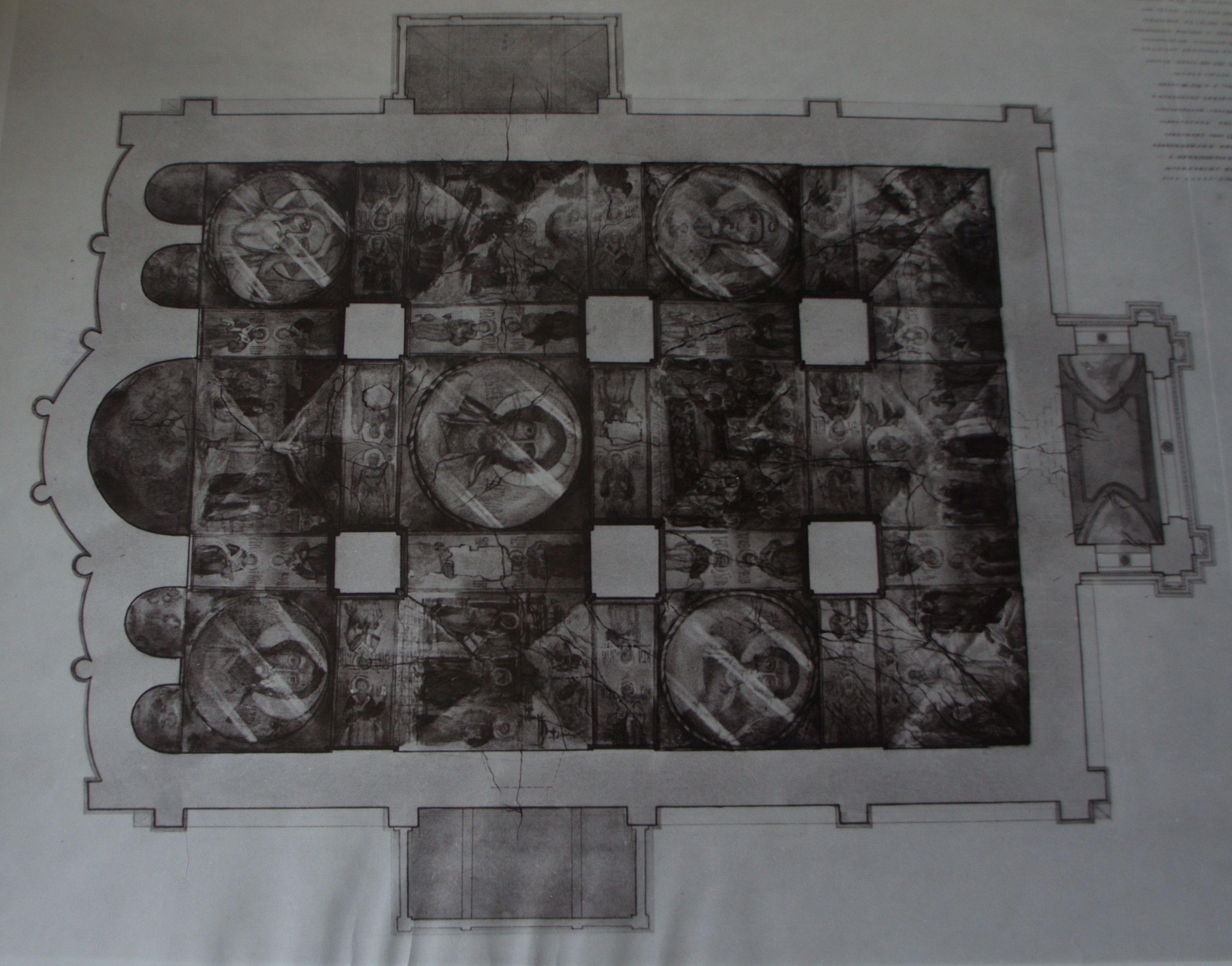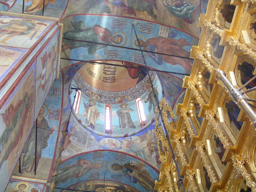 Достаточно долгое время Успенский собор оставался не расписанным, и единственным значительным его украшением был иконостас. В 1684 году собор был расписан на деньги, выделенные архиепископом Рязанским Моисеем, который после кончины был в нем погребен[18]. Роспись была выполнена спешно – за 100 дней (за одно лето) 35 домовых мастеров расписали собор полностью. С чем связана такая спешка ― неизвестно. Живопись выполнили монастырские (троицкие) иконописцы и приглашенные ярославские[19] под руководством ярославского иконописца Дмитрия Григорьева. Летопись, находящаяся в западной части собора, зафиксировала имена художников, выполнявших роспись, и дату ее создания. В дальнейшем эта живопись неоднократно поновлялась.