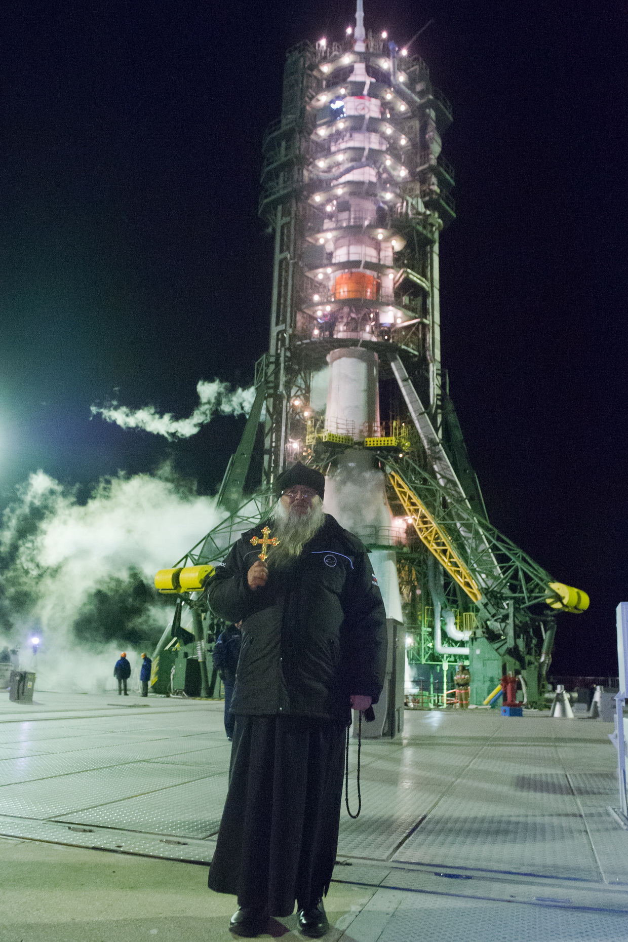 Встречает космонавтов в Лавре, служит молебен в Никоновском приделе Троицкого собора насельник Свято-Троицкой Сергиевой Лавры игумен Иов (Талац). Он также является настоятелем храма в Звездном городке. Впервые отец Иов приехал в Звездный в 2003 году. И вот уже 12-й год духовно окормляет космонавтов, даже космическую подготовку проходил вместе с ними. Конечно, в ограниченном режиме.
