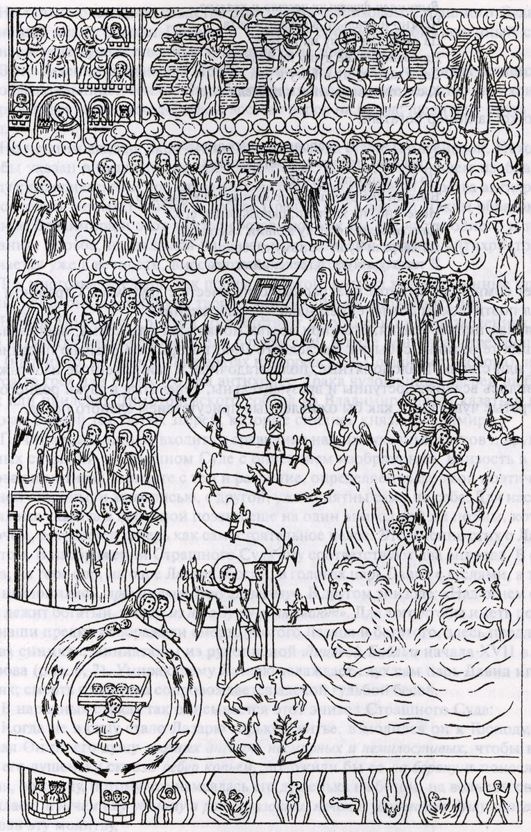 Понятно, что сочинение это, имеющее предметом господствовавшие в средние века идеи о загробной жизни, о мытарствах и Страшном Суде, должно было особенно распространиться между читателями Древней Руси, о чем свидетельствует множество списков этого сочинения, рассеянных по всем концам нашего отечества. Не только в XVII, но даже в XVIII и XIX вв. оно переписывалось и украшалось множеством миниатюр. О влиянии этого жития на Авраамия Смоленского и вообще на русских писателей XII в. было упомянуто выше. Оно же, как увидим теперь, оставило свои явственные следы в русском изображении Страшного Суда, а таким образом к древнехристианской символике присовокупило новый элемент влияния византийского, элемент литературного характера.