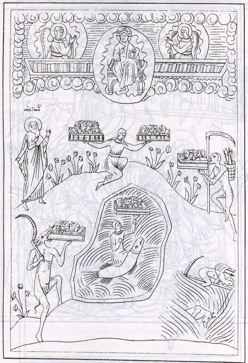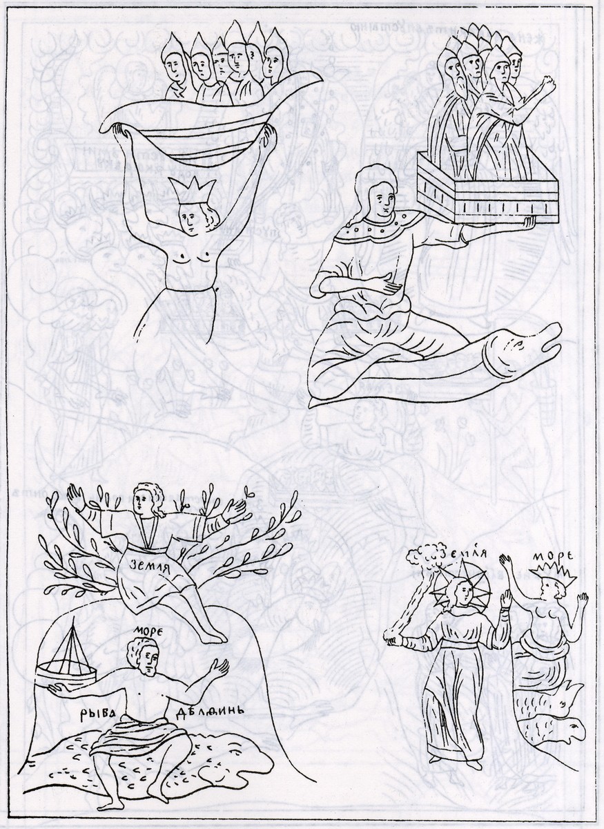 К глубокой древности должно отнести в византийских представлениях Второго Пришествия и Страшного Суда аллегорическое изображение Земли и Моря в виде женщин, своими атрибутами напоминающих античные типы. Так, в Ватопедском монастыре (на Афонской горе) на фреске Страшного Суда земля изображена под видом сильной и полной женщины, роскошно одетой. Она увенчана цветами. В одной руке держит пучок ветвей с плодами, в другой – змею. Сидит на двух львах, поддерживаемая двумя орлами. Фигура женщины, изображающей море, более нежная и гибкая, как помпейская Нереида, скользит по волнам между двумя морскими чудовищами. В одной руке держит корабль, который она некогда поглотила и теперь возвращает; в другой держит обнаженного человека. По сторонам дуют четыре ветра под видом четырех голов; одна юношеская, остальные – старческие.