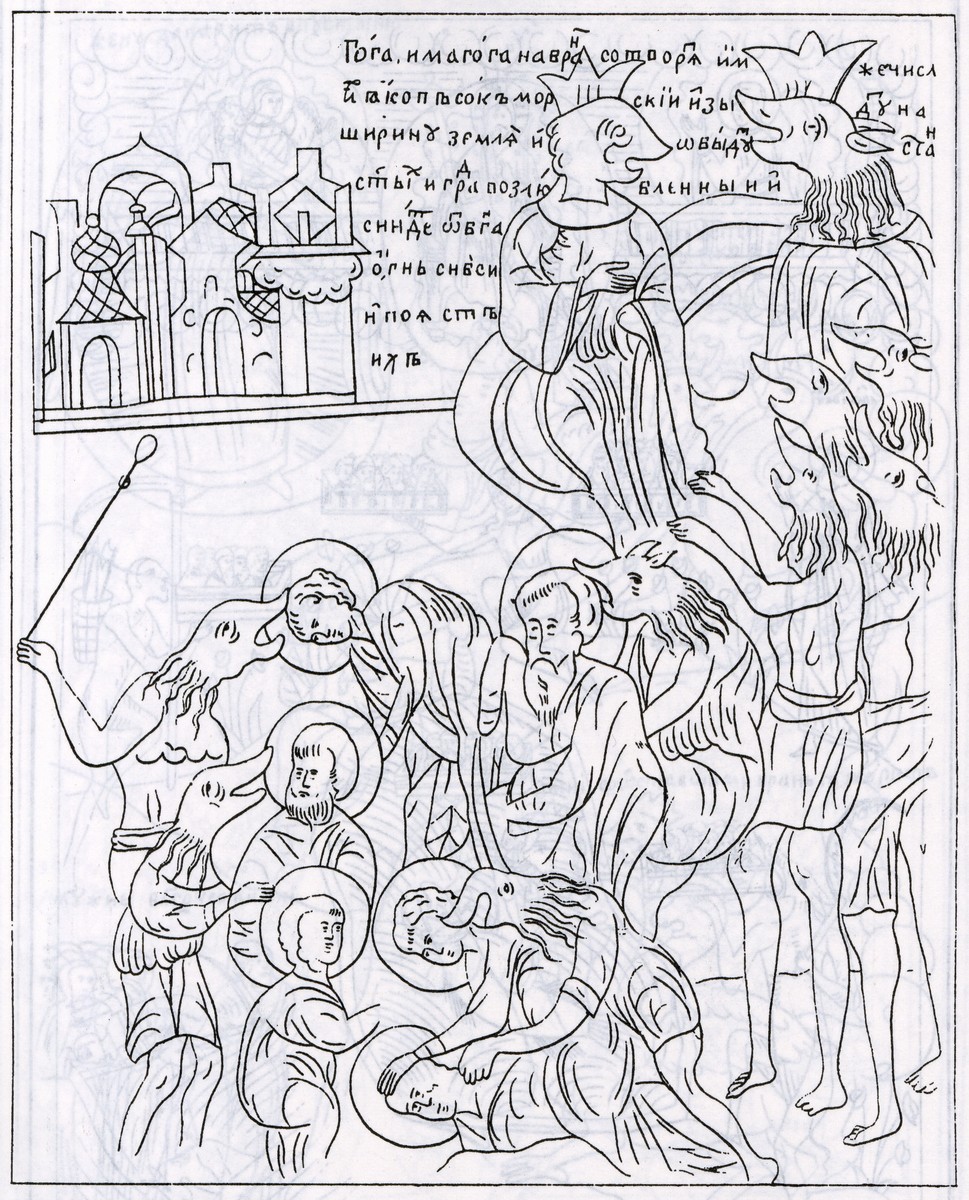 Вообще трудно решить, откуда заимствованы в нашем подлиннике песьи головы – из общего ли средневекового предания, восходящего к эпохе переселения народов, или из какого другого источника. Может быть, нельзя здесь отказать в участии и средневековым сказаниям об Александре Македонском, которые были так распространены в нашей древней письменности. Этот знаменитый герой между многими другими чудовищами встречается и с песьими головами, или кинокефалами. К этому следует присовокупить, что Гог и Магог с их грозными полчищами изображались с собачьими головами, как это можно видеть из прилагаемого здесь снимка с миниатюры из рукописного Апокалипсиса XVI в., принадлежащего автору (рис. 5). Язычники индиане могли войти на Страшный Суд под влиянием истории о Варлааме и Иоасафе, царевиче индийском.