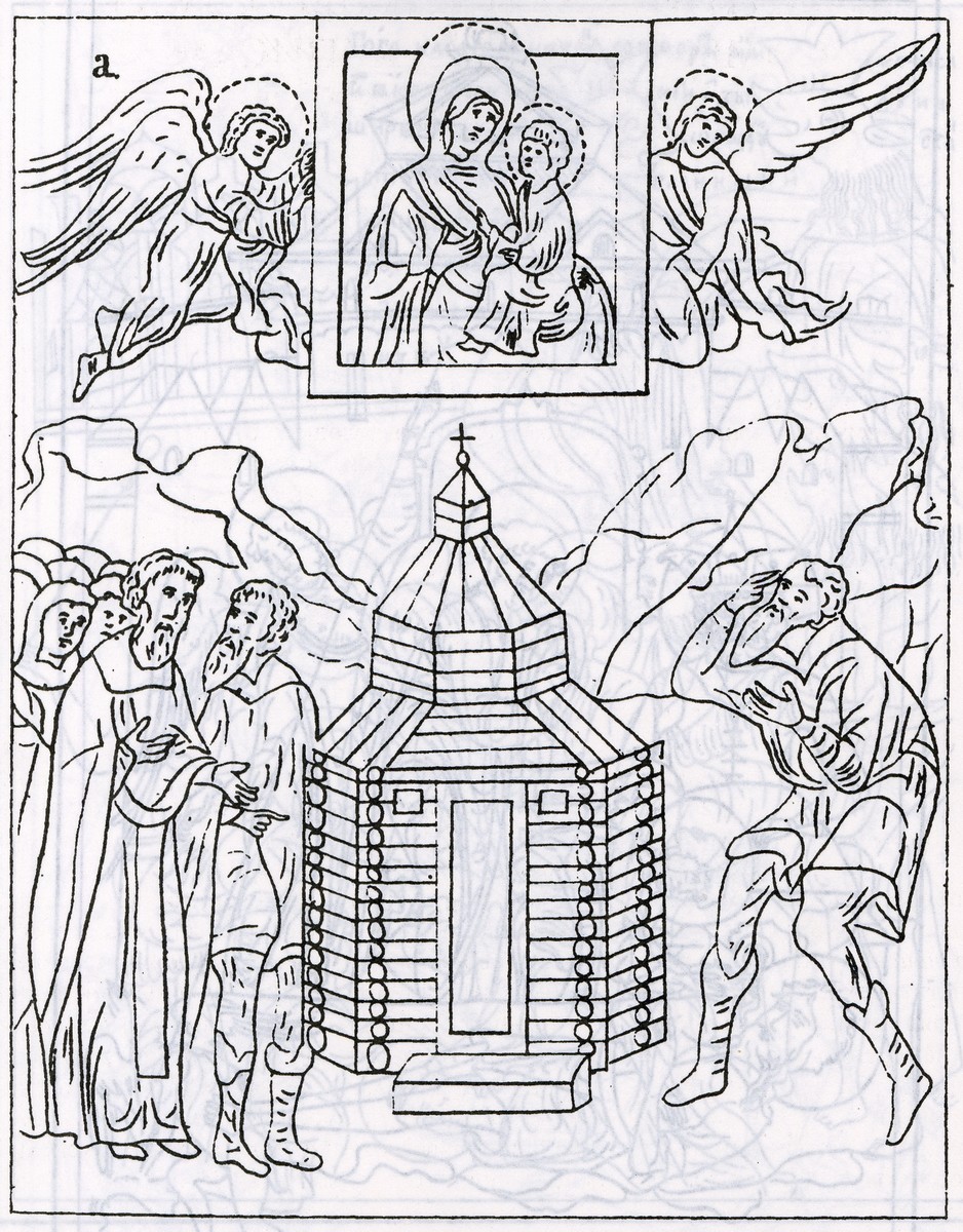 «С краю горный Иерусалим, а в нем церкви и палаты, а во дверях ангелы и шесть ликов: первый лик – преподобных жен, второй – мучеников, третий – страстотерпцев, четвертый – преподобных, пятый – святителей, шестой – пророков. От города облак силы, а в облаке Отец на престоле, а около херувимы маленькие; Сын благословляется от Отца, и потом идет к Отцу; потом Отец и Сын сели в облаке. Под Ними лавка, а под ногами у Них многоочитые. От ног Их пошла река, и тут отпадший лик, и престол криво стоит, а отпадшие пошли в огонь.