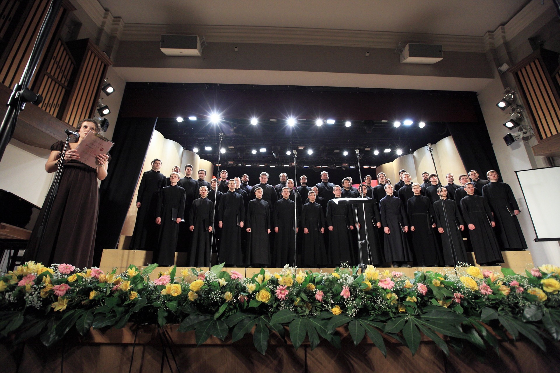 Собравшихся в концертном зале приветствовал игумен Андроник (Трубачев), сын композитора и диакона Свято-Троицкой Сергиевой Лавры Сергия Зосимовича Трубачева, чьи песнопения, в основном, составили в этот день концертный репертуар хора Лавры: