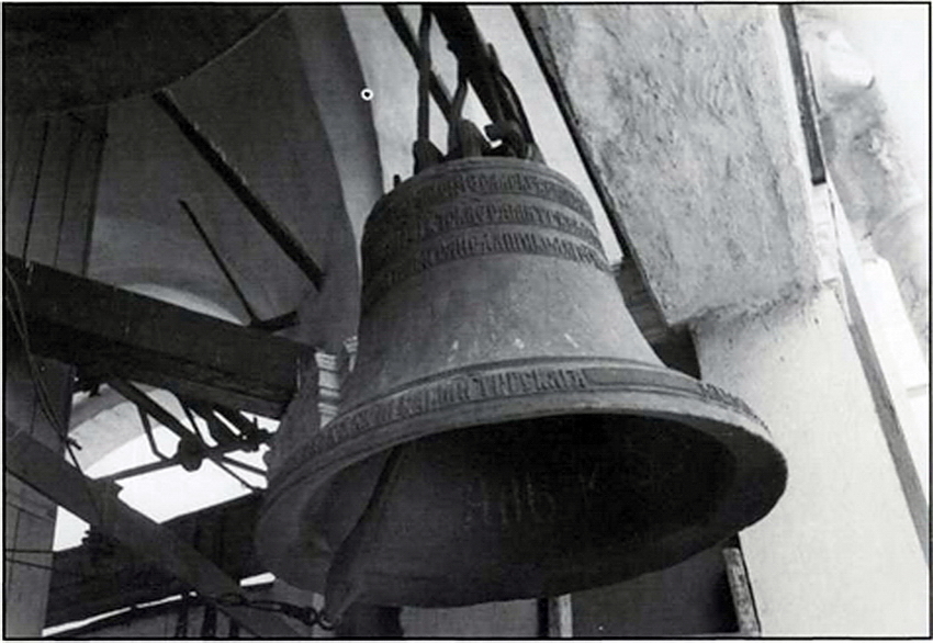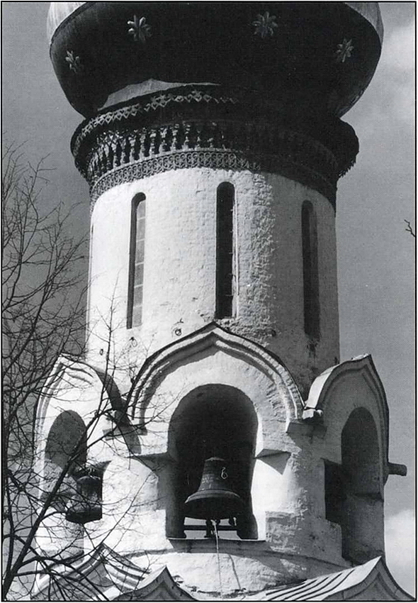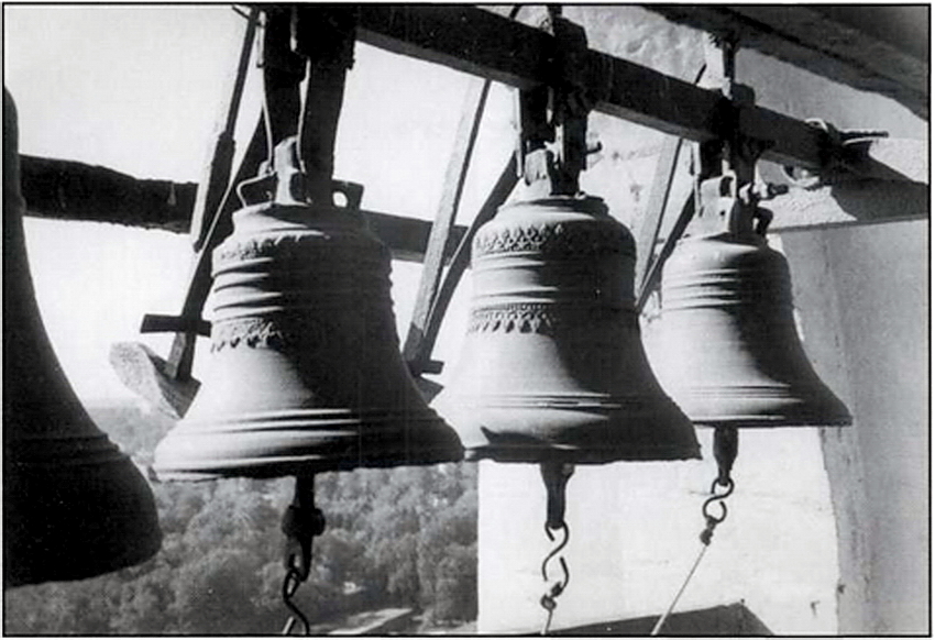 Первые колокола появились в монастыре в XV в. Со временем их численность заметно возросла. Потребовалось строительство и специальных колоколонесущих сооружений. В 1476 г. здесь была построена Духовская церковь (ил. 6–7) – «иже под колоколы» – с приземистой звонницей над храмом, в арочных проемах которой размещались колокола. А в конце XVI в. между этой церковью и Троицким собором была возведена уже «колокольница» шатровая на 5-ти столбах. О сложившейся коллекции древних колоколов достаточно полно отражено в Описи Троице-Сергиева монастыря 1641 г. В то время здесь числилось 9 больших благовестных и 30 средних и «меньших» колоколов. Помимо Духовской церкви и «колокольницы», колокола размещались также на церкви Чудотворца Сергия «на воротах» («два колокола невелики») и Больничной церкви Зосимы и Савватия Соловецких («колокол благовестной да четыре колокола зазвонных, все невелики»). Среди больших благовестных два колокола упоминаются как «дача царя и великого князя Бориса Федоровича всеа Руссии». В один колокол, как говорится в Описи, звонили «в празднества большие», в другой весом 625 пудов – в менее торжественные праздники (полиелейные). Имелись и такие колокола, которые использовались по специальному назначению. Это «застольный» колокол, связанный, вероятно, с монастырской трапезой, и «всполошной» (на Духовской церкви), в который звонили в тревожные для монастыря дни, как, например, при подступе поляков к Троицкому монастырю в 1608–1610 гг. во времена польско-литовской интервенции в России. Об этом, в частности, говорится в «Сказании» Авраамия Палицына, келаря Троицкого монастыря (1607–1620 гг.): «Стражи же увидевше с церкви заводных людей во вратах стоящих, нача шабити в осадной колокол».
