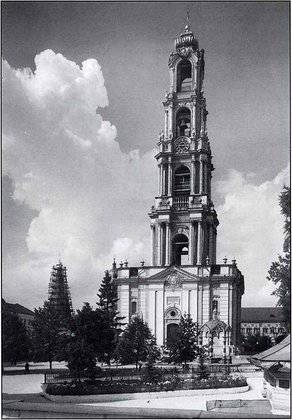 Троицкие колокола XVIII–XIX вв., в основном, были массовой отливки, малоинтересными в художественном отношении. Исключение среди них составлял троицкий «Царь-колокол», о существовании которого по сравнению с московским знают немногие. Отлит он был вскоре после него. А идея его создания теснейшим образом была связана не только с возведением новой колокольни (1740–1770) (ил.14), но и большой заинтересованностью светских и монастырских властей. Сама императрица Елизавета Петровна вела строгое наблюдение за строительством колокольни. Указ предписывал: «Зачатую строением каменную колокольню строить неспешно, чтоб оная на фундаменте отстояться могла без повреждения, и для того, дабы большой колокол перелитием к постановке в ту новую колокольню изготовился, ибо по рисунку той колокольни надлежит тому большому колоколу быть во втором апартаменте». Нужно отметить, что к этому времени был уже накоплен достаточно большой опыт по созданию колоколов-гигантов. Не случайно, что для отливки троицкого был приглашен Михаил Моторин, работавший вместе с отцом Иваном Федоровичем над созданием московского, а с ним и другие опытные мастера-литейщики как Семен Степанов и Гавриил Лукьянович Смирнов, которые непосредственно и отливали колокол.
