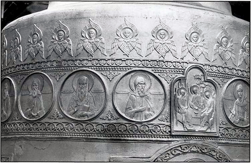 Принципиально иной подход к оформлению мы видим на «Царь-колоколе». Его художественное убранство отличается особой пышностью (ил. 20–23). Здесь также использована традиционная поярусная схема, но только декор плотно заполняет почти всю поверхность тулова. Явное предпочтение здесь отдано не орнаменту, а изобразительному ряду. Верхняя часть колокола (плечи) украшена широким фризом из нескольких поясов: между орнаментальными полосками размещены поясные фигуры святых в медальонах, над ними – ряд одинаковых шестикрылых херувимов и серафимов. Основной изобразительный ряд представлен на центральной части тулова – композиции из трех фигур в рост в орнаментальном обрамлении: Спаситель с преподобными Сергием и Никоном Радонежскими; Богоматерь с канонизированными наместниками Лавры Антонием и Кронидом; преподобные святые, радонежские чудотворцы: Максим Грек, Дионисий (Зобниновский) и Михей; московские митрополиты Иннокентий, Филарет (Дроздов) и Макарий (ил. 23).