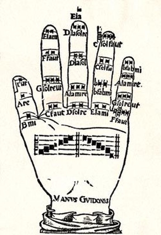 Помимо всего прочего, Гвидо принадлежит и огромная заслуга в прогрессе письменной части нотной грамоты. Во время выступления хора, Гвидо для указания нот использовал свою левую руку, сгибая суставы пальцев он указывал, какую ноту брать в то или иное время: