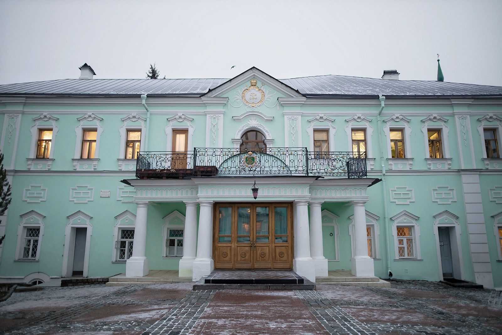 Внутри строения удивляет разящая противоположность темного и низкого нижнего этажа, где помещались различные службы, с просторными покоями наверху. На втором этаже наиболее характерна Царская палата – главный зал этажа, служивший, вероятно, приемной митр. Платону, при котором он был отделан. Сводчатый потолок лепной работы вместе со стенами расписан во вкусе, приближающемся к стилю Луи XVI. В углу палаты прекрасно сохранилась печь из расписных и фигурных изразцов.