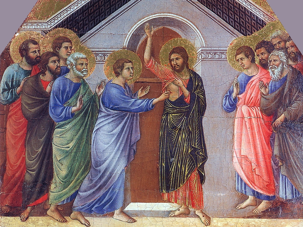 В первый день воскресения Своего, вечером, Господь явился святым апостолам и обрадовал их Своим воскресением. Святого апостола Фомы не было тогда с ними. Когда пришел он, другие апостолы уверяли его: «Мы видели Господа»; но он в ту пору был в таком расположении духа, что не согласился поверить свидетельству их, и решительно ответил, что если сам не увидит очами своими, и не осязает руками своими язв на теле Господа, никак не поверит. Целую неделю пробыл он в таком томительном состоянии неуверенности в воскресении Господа. Господь видел эту тяготу сердца его и из жалости к нему, в другое воскресенье, «снова явившись всем ученикам, когда и святой Фома был с ними, после приветствия всех миром, тотчас обратился к апостолу Фоме и сказал: «Подай перст твой сюда, и посмотри руки Мои: подай руку твою, и вложи; в ребра Мои; и не будь неверующим, ню верующим» (Ин. 20, 27). Ты желал осязательных удостоверений в Моем воскресении, — приди, осяжи и виждь, только не будь неверен, но верен. Тогда святой апостол в сильном движении веры воззвал: Господь мой и Бог мой! (Ин. 20, 28).