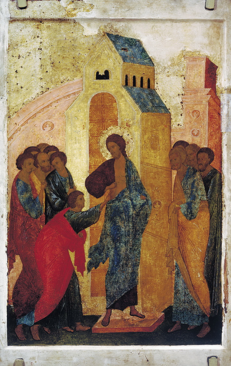 Любопы́тною десни́цею жизнопода́тельная Твоя́ ре́бра Фома́ испыта́, Христе́ Бо́же,/ созаключе́нным бо две́рем я́ко вшел еси́,/ с про́чими апо́столы вопия́ше Тебе́:// Госпо́дь еси́ и Бог мой.