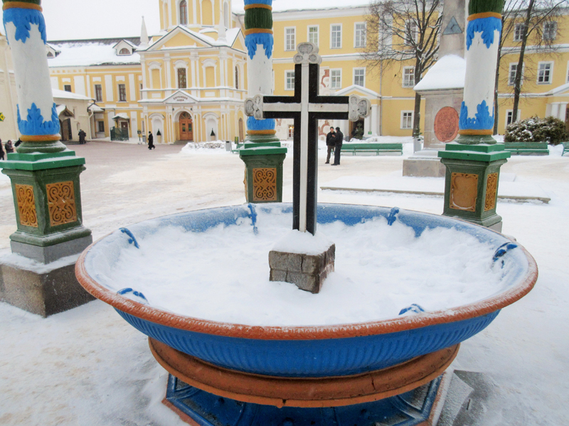 Между часовней и памятником-обелиском на Соборной площади находится также чугунная чаша с крестом под навесом. Сооружение возвели в конце XIX века. Вода в этот бассейн поступает не из источника под Успенской часовней, а из монастырского водопровода. Так как зимой бассейн замерзает, паломники могут набрать воду только в часовне над Успенским колодцем.