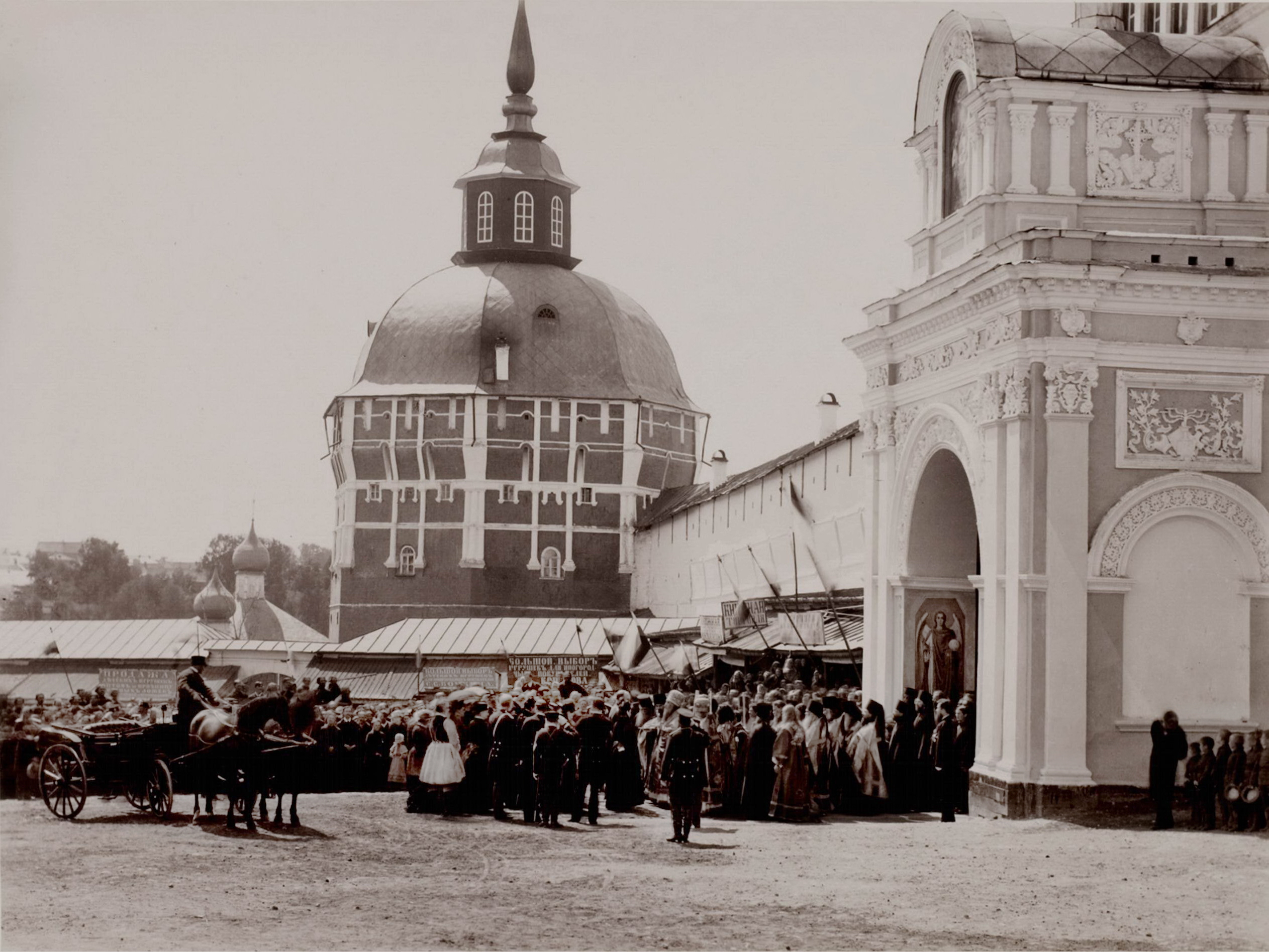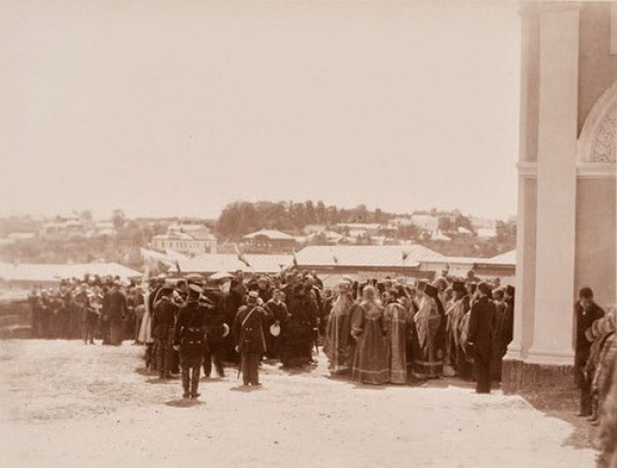 8. По отпусте – молебны и многолетии; поднесены были государю императору и всем членам царствующего Дома просфоры; затем государь прикладывался к местным иконам и к мощам преподобного Сергия, где поднесены были Ему – образ посещения (складень), копия с чудотворного, бывающего в военных походах, а государыне – образ Богоматери Черниговской, тоже копия с чудотворного образа, находящегося в пещерах при Гефсиманском ските.