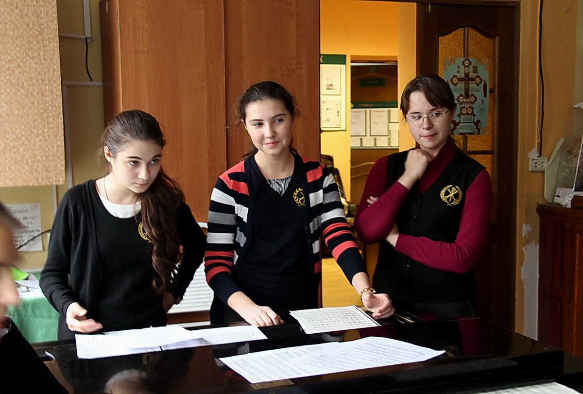 Таня горячо репетировала у рояля вместе с другими ребятами, не терпя ошибок. Репетиции обычно проходят в храме, где и стоит рояль. В храме – самодельные подсвечники, которые будто переделены из парт. Она собирается поступать в регентскую школу при МДА, так же бойко эта девушка с темными, яркими волосами отвечает, как и на темп музыки.