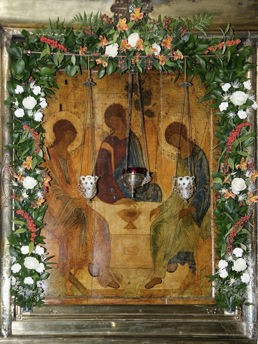 Рублевская «Троица» – это иконописное изображение акта величайшей, по учению христианской Церкви, жертвенной любви. И потому, приходя в день Святой Троицы и праздник отдания Пятидесятницы в храм, давайте будем вспоминать слова из блаженного Августина, который призвал всех «верить, что Отец, Сын и Дух Святой являются Единым Богом, Создателем и Правителем сотворенной Вселенной; и что ни Отец не есть Сын, ни Дух Святой не есть Отец или Сын, но что Троица состоит во взаимном общении Лиц и в равносущном единстве» (Блаженный Августин «О Троице», часть 2, кн. 9). И верить в Троицу, Единосущную и Нераздельную.
